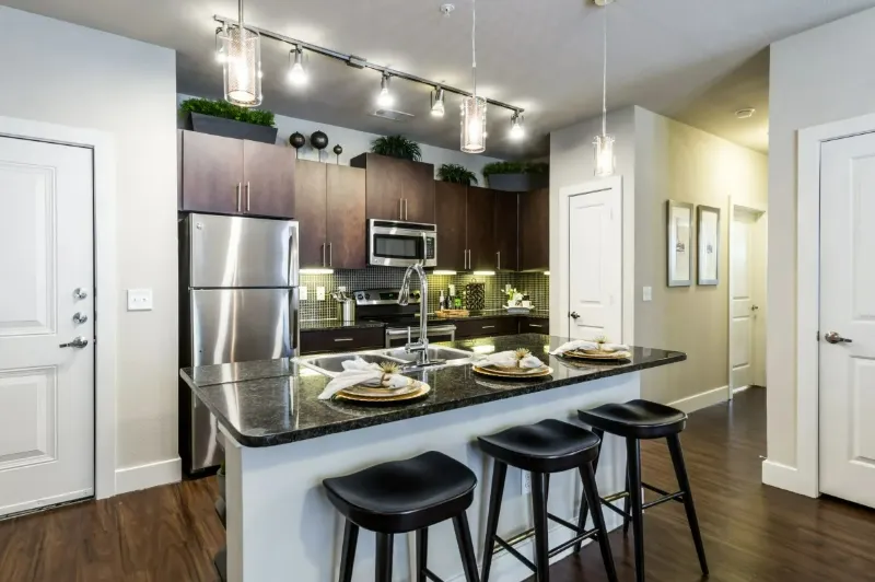 Step inside, and the thoughtful design immediately stands out. Each apartment—available in one-, two-, and three-bedroom layouts—features open-concept living spaces that maximize natural light and flow. The finishes are a blend of modern polish and comfort, offering wood-style flooring, plush bedroom carpeting, and a neutral two-tone paint scheme that complements any décor style. The kitchens feel custom-built, with granite countertops, ceramic tile backsplashes, and sleek stainless steel appliances, including double ovens and double sinks with gooseneck faucets. Details like pendant and under-cabinet lighting, spacious pantries, and USB outlets add both practicality and elegance.