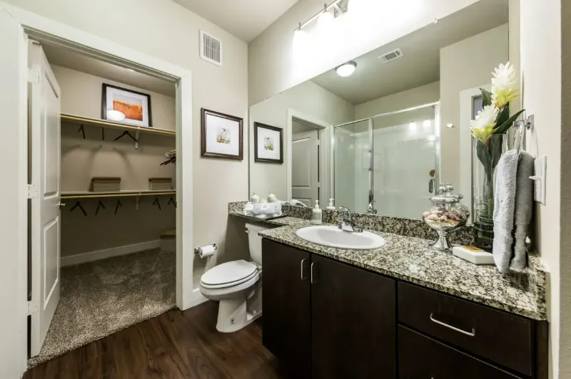 The living spaces are designed to make every day more enjoyable. Custom wood cabinetry and oversized wood trim add a warm, high-end touch, while the private patios or balconies—with built-in storage closets—extend your living space outdoors. Each apartment also comes with full-size washers and dryers, walk-in and linen closets with built-in shelving, and 2-inch wood-style blinds for a refined finish. Select homes offer master suites with oval garden tubs and separate walk-in showers, turning daily routines into spa-like experiences. Every element here feels carefully chosen to elevate comfort and convenience.